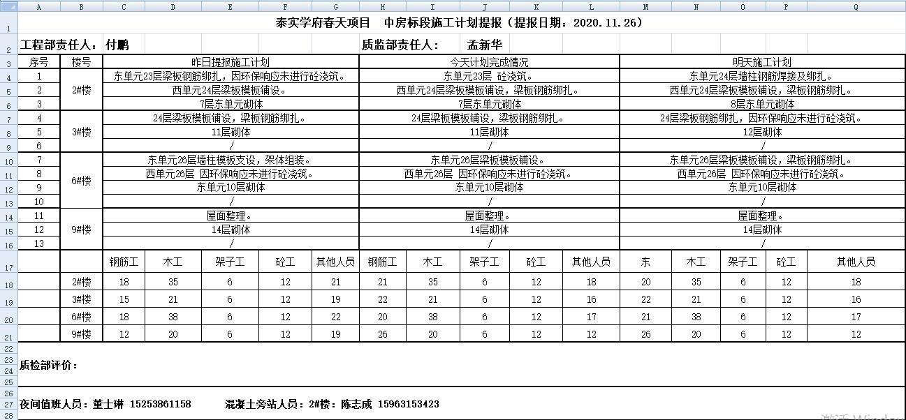 泰安學(xué)府春天桃李園工程項目于2019年12月20日開工,計劃竣工日期為2021年9月竣工,截至目前2020年11月27日2#樓主體施工至24層砌體8層;3#樓主體施工至24層砌體12層;6#樓主體施工至26層砌體10層;9#樓屋面施工砌體15層;4棟單體周邊車庫按施工計劃施工中;2#公建對基礎(chǔ)進行挖槽施工。中房建工將層層落實、區(qū)域劃分、穩(wěn)步推進、逐步完成,確保項目按計劃工期順利交付。(王帥)