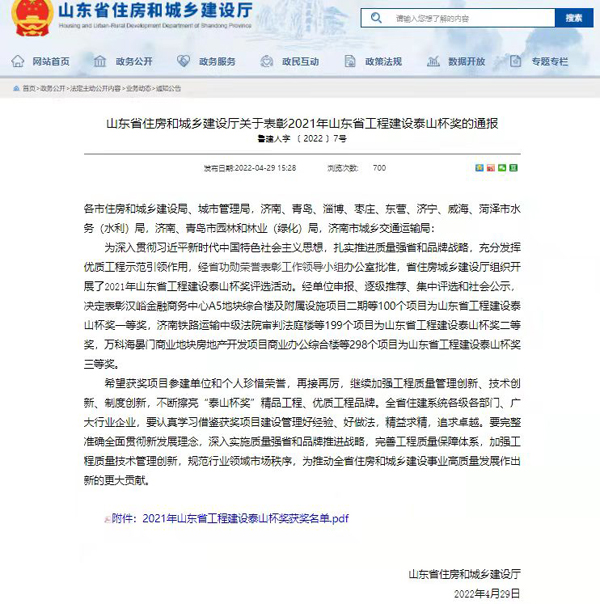 近日,由山東中房建筑工程有限公司承建的東城田園第一園A區(qū)1#樓項目被評為“山東省工程建設(shè)泰山杯獎”榮譽(yù)稱號?!吧綎|省工程建設(shè)泰山杯獎”每年評選一次,是山東省建筑行業(yè)工程質(zhì)量方面的最高榮譽(yù)獎項,代表全省建筑領(lǐng)域工程質(zhì)量的最高成果。
