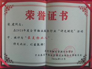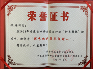 12月17日,在泰安市物業(yè)行業(yè)管理協會第三屆第二次會員代表大會上,華通物業(yè)獲得泰安物協頒發(fā)的2024年度“優(yōu)秀會員企業(yè)”、“優(yōu)秀物業(yè)項目”榮譽,公司經理徐海榮獲“優(yōu)秀物業(yè)服務經理人”,安建、王振濤分別獲得“最美物業(yè)人”稱號。(劉劍)