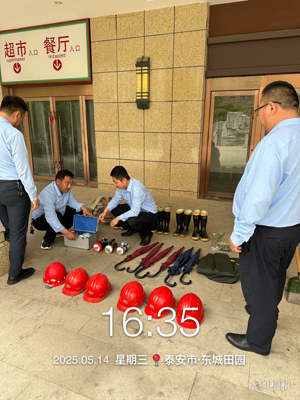 實地檢查防汛物資過程中,檢查小組現(xiàn)場清點核對鐵鍬、照明燈、雨衣、雨靴等物資數(shù)量,并對地下車庫出入口沙袋進行檢查,查看是否有破損情況,數(shù)量是否充足。除此之外,檢查組還對抽水泵、照明設備等物資進行調(diào)試,確保物資完好,使用正常,能夠隨時投入使用。